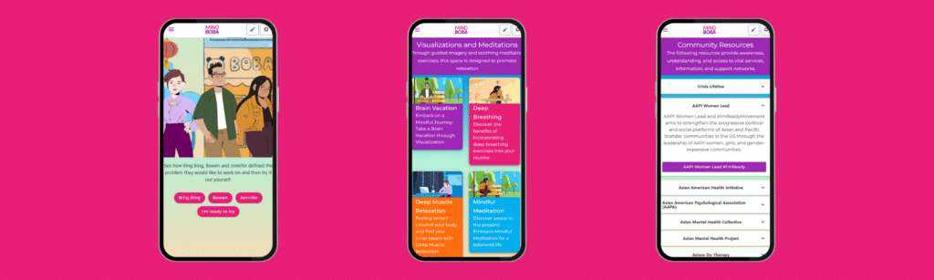 To better support the mental health needs of Chinese and Taiwanese Americans, Trifoia and its partners developed MindBoba – a progressive web app based on Problem-Solving Therapy (PST). MindBoba uses relatable stories, interactive exercises, and audio-guided practices to help users manage stress and build problem-solving skills. Every element – from illustrations to journaling prompts – was thoughtfully developed to reflect culturally relevant themes and everyday experiences. The app provides a supportive, engaging space for users to explore their challenges and develop strategies to navigate them.